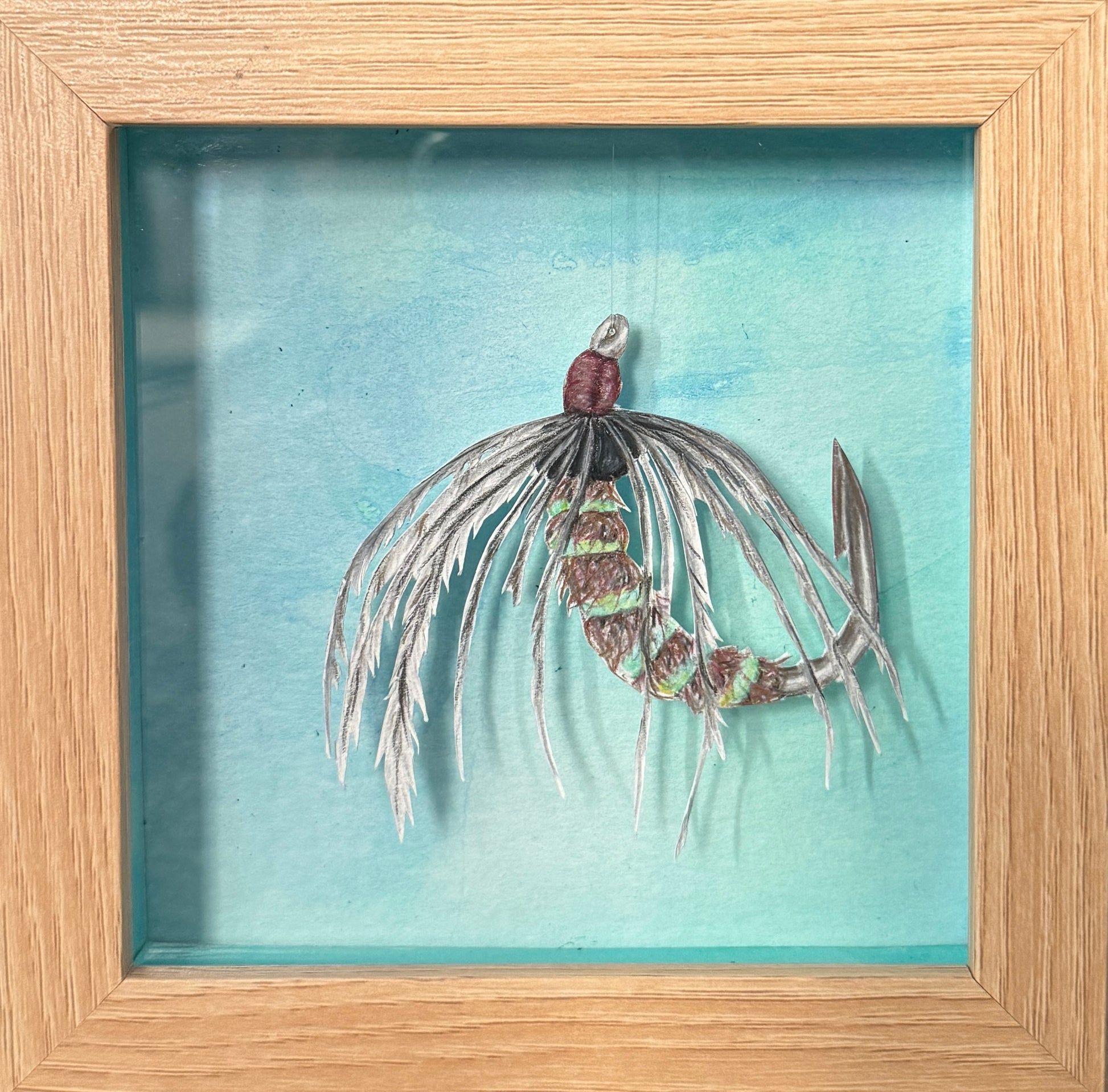 This emerging caddis larvae inspired fly was drawn in colored pencil, hand cut out, and attached with fishing line into a foam box I hand built. The background and walls of foam box are painted with green and blue India Ink.